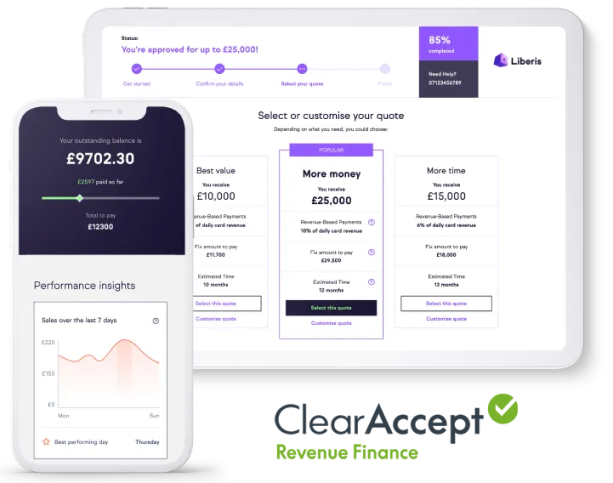 This product is provided by Liberis Ltd, Scale Space Building, 1st Floor, 58 Wood Lane London, W12 7RZ (Company number: 05654231). ClearAccept Ltd will receive commission from Liberis following a successful referral. Liberis is not authorised or regulated by the Financial Conduct Authority. Your funding is not protected under the Financial Services Compensation Scheme (FSCS), nor will the Financial Ombudsman Service be able to consider a complaint about Liberis. Amounts advanced are subject to status and our underwriting process before any offer can be made.